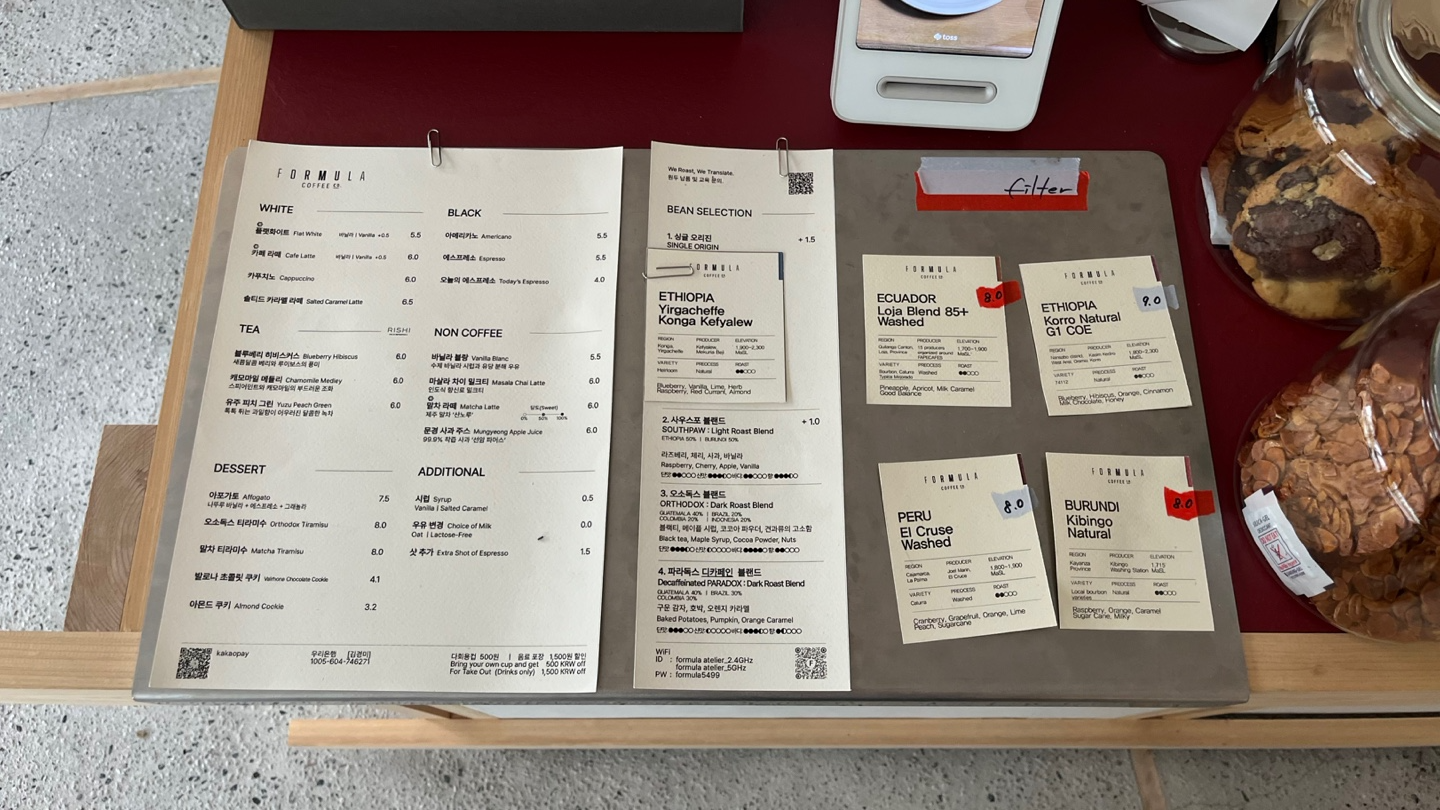 포뮬라 커피는 다양한 싱글오리진 원두를 다루며, 드립, 에스프레소 베이스 음료뿐 아니라 티, 논커피 메뉴도 포함되어 있었어요.