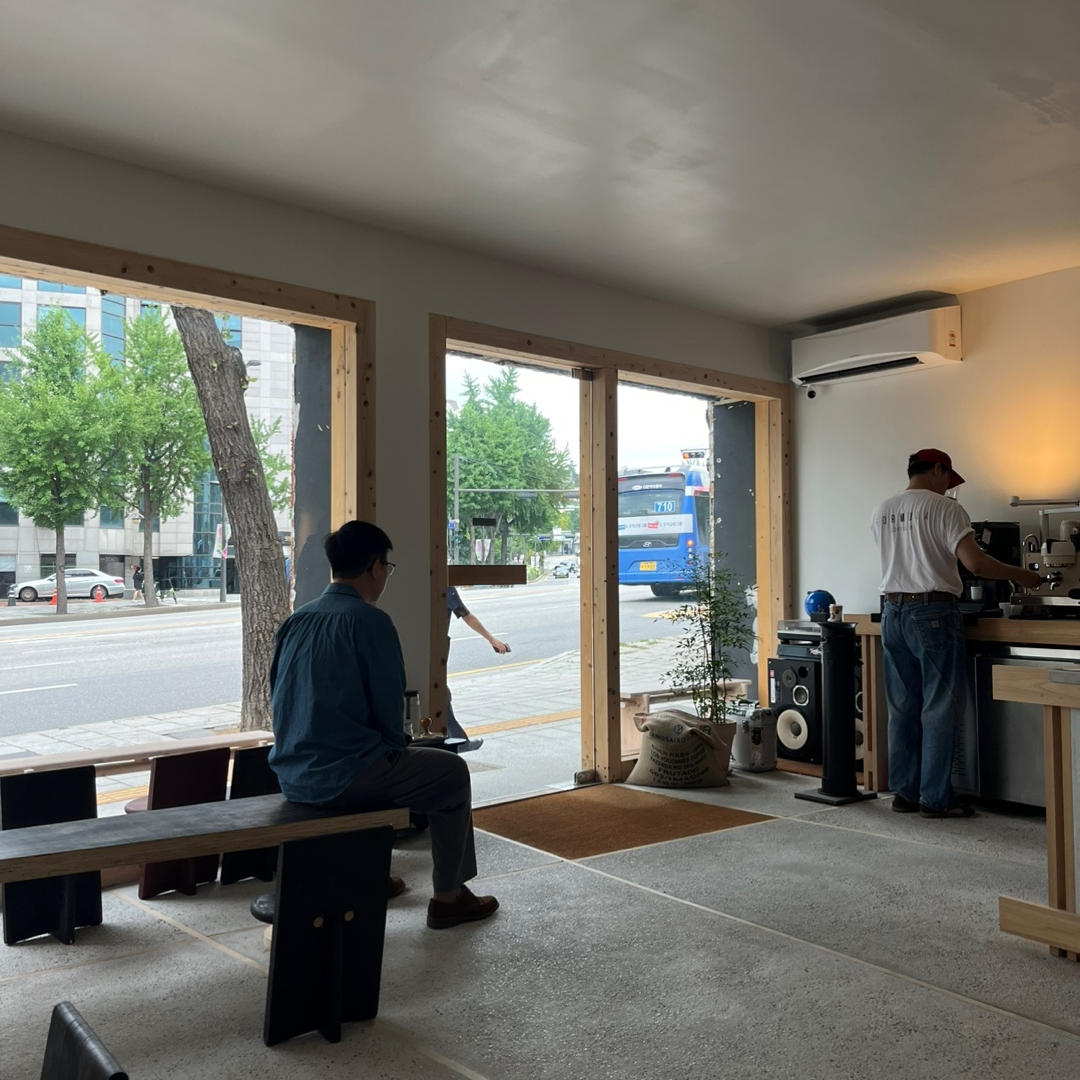 바리스타분들의 동선이 잘 정리되어 있고, 내부 좌석도 간결한 목재 중심의 디자인으로 구성되어 있습니다.