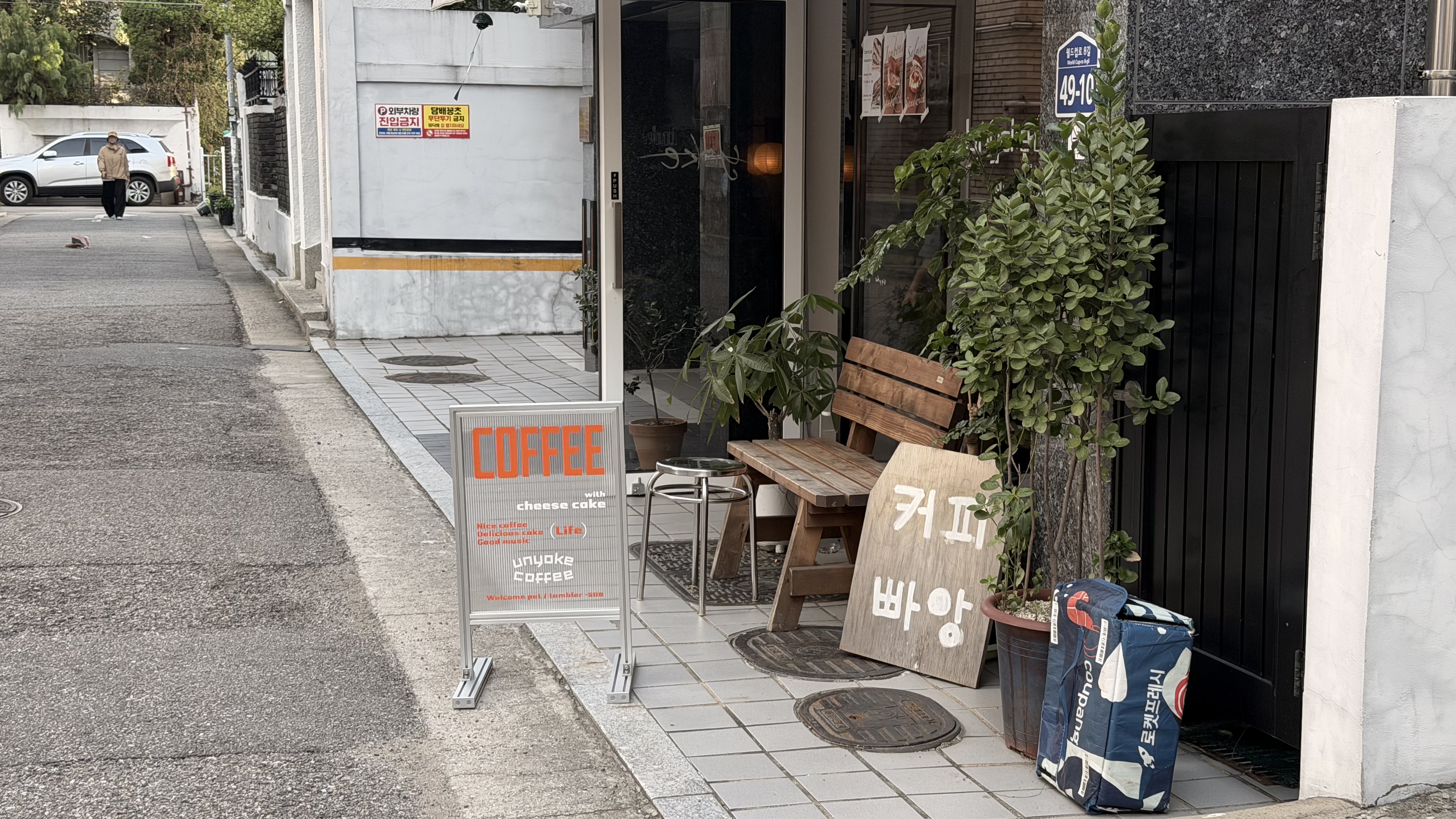 도로 한편에 ‘COFFEE’라고 적힌 입간판이 놓여 있고, 그 뒤로 작은 문과 나무 의자가 놓여 있었어요.