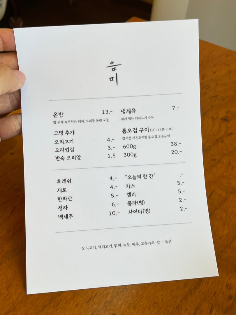 메뉴판에는 “밥 위에 녹두전과 돼지, 오리를 올린 국물 요리”라고 적혀 있었어요.